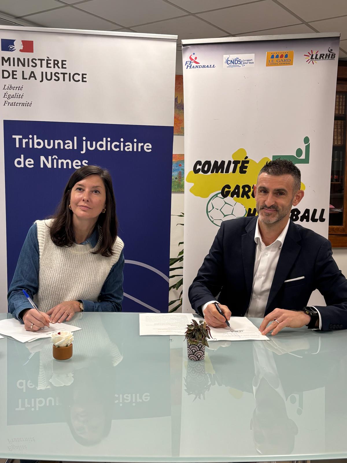 En ce mois de décembre, un protocole a été signé entre le Comité du Gard de Handball, via le président Samuel CHATARD et le Ministère de la Justice , représenté par Nathalie WELTE, procureure adjoint du tribunal de Nîmes.